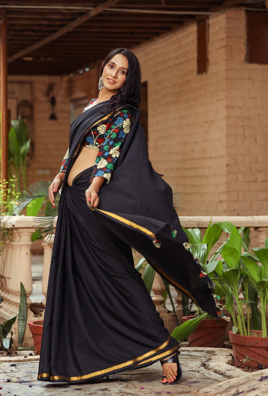 Extra RS.200 OFFBlack Cotton Saree with Golden Border