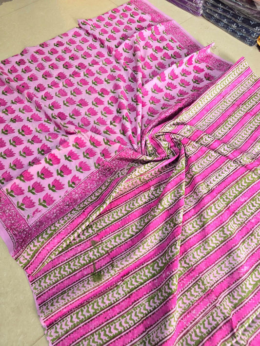 Extra RS.200 OFFPink Bloom Handblock Mul Cotton Saree
