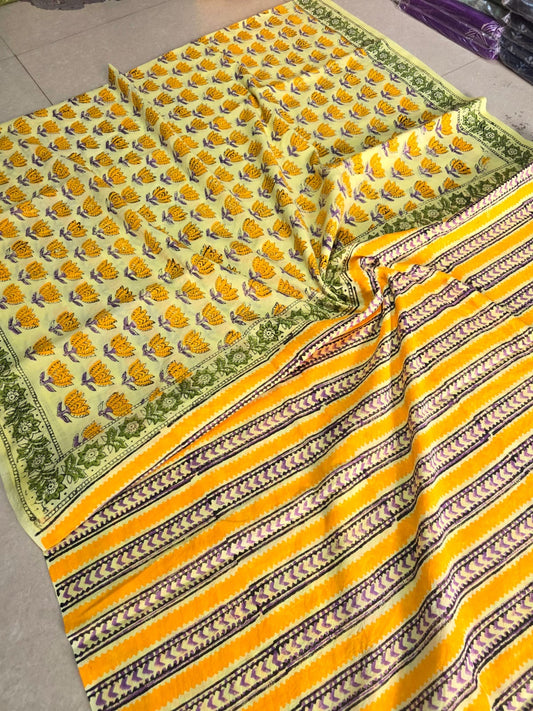 Extra RS.200 OFFYellow Bloom Handblock Mul Cotton Saree