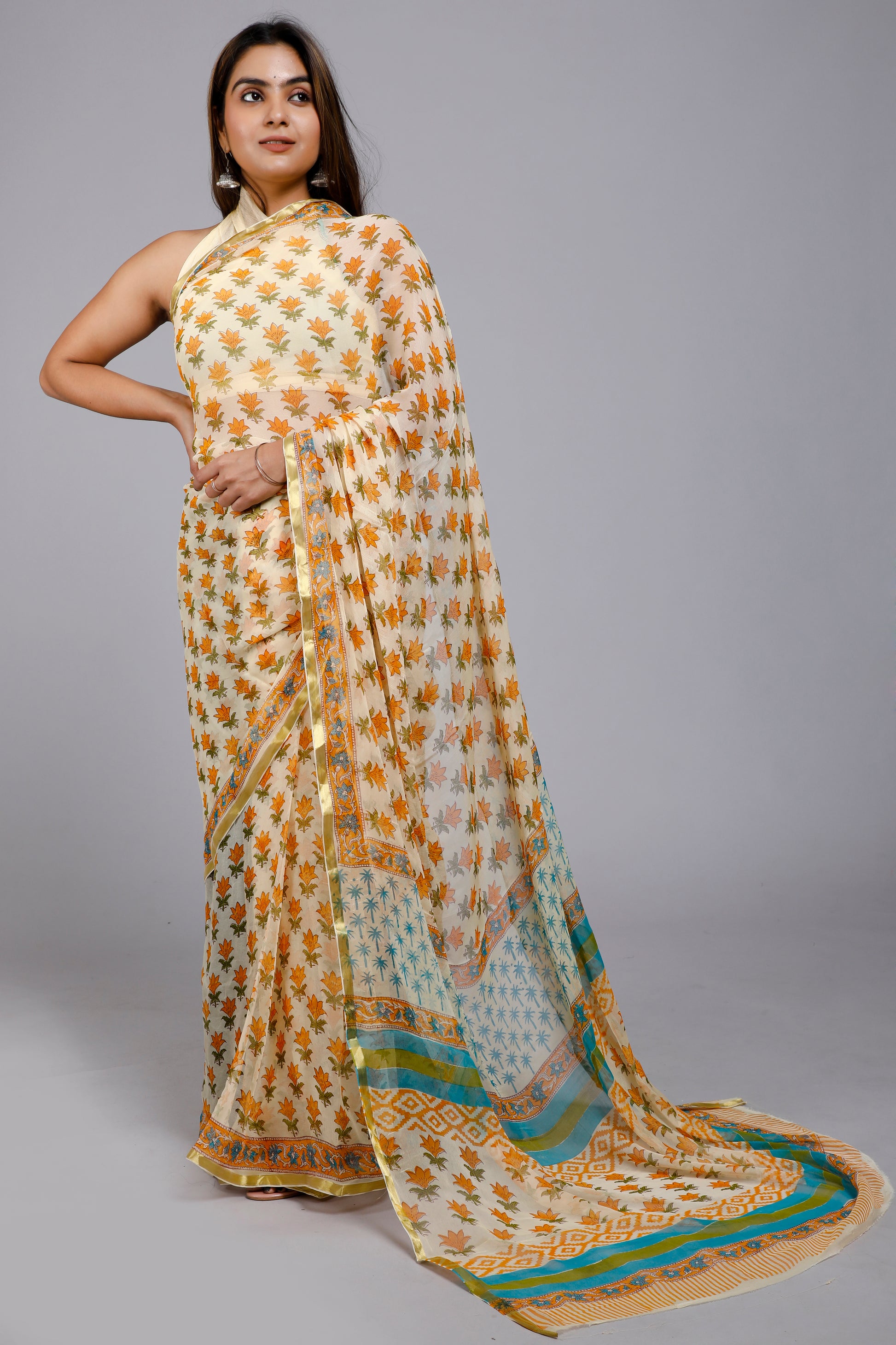 Crafted from lightweight, airy chiffon, it drapes beautifully and moves with ease, giving you a timeless and graceful silhouette. The hand-block motifs, inspired by nature and heritage patterns, add a touch of understated sophistication.